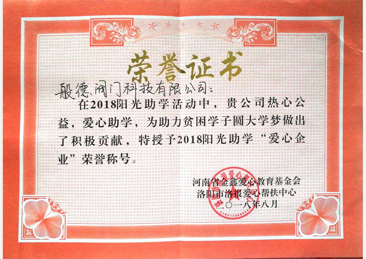 - 2018陽(yáng)光助學(xué)“愛(ài)心企業(yè)”>>查看證書(shū)