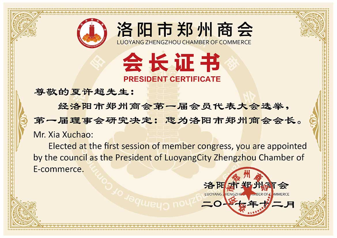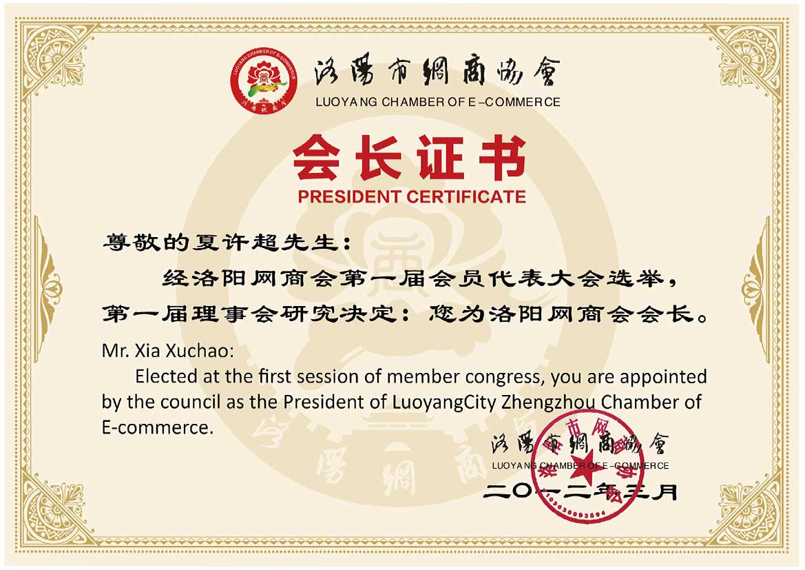 - 洛陽(yáng)市網(wǎng)商會(huì)會(huì)長(zhǎng)>>查看證書(shū)