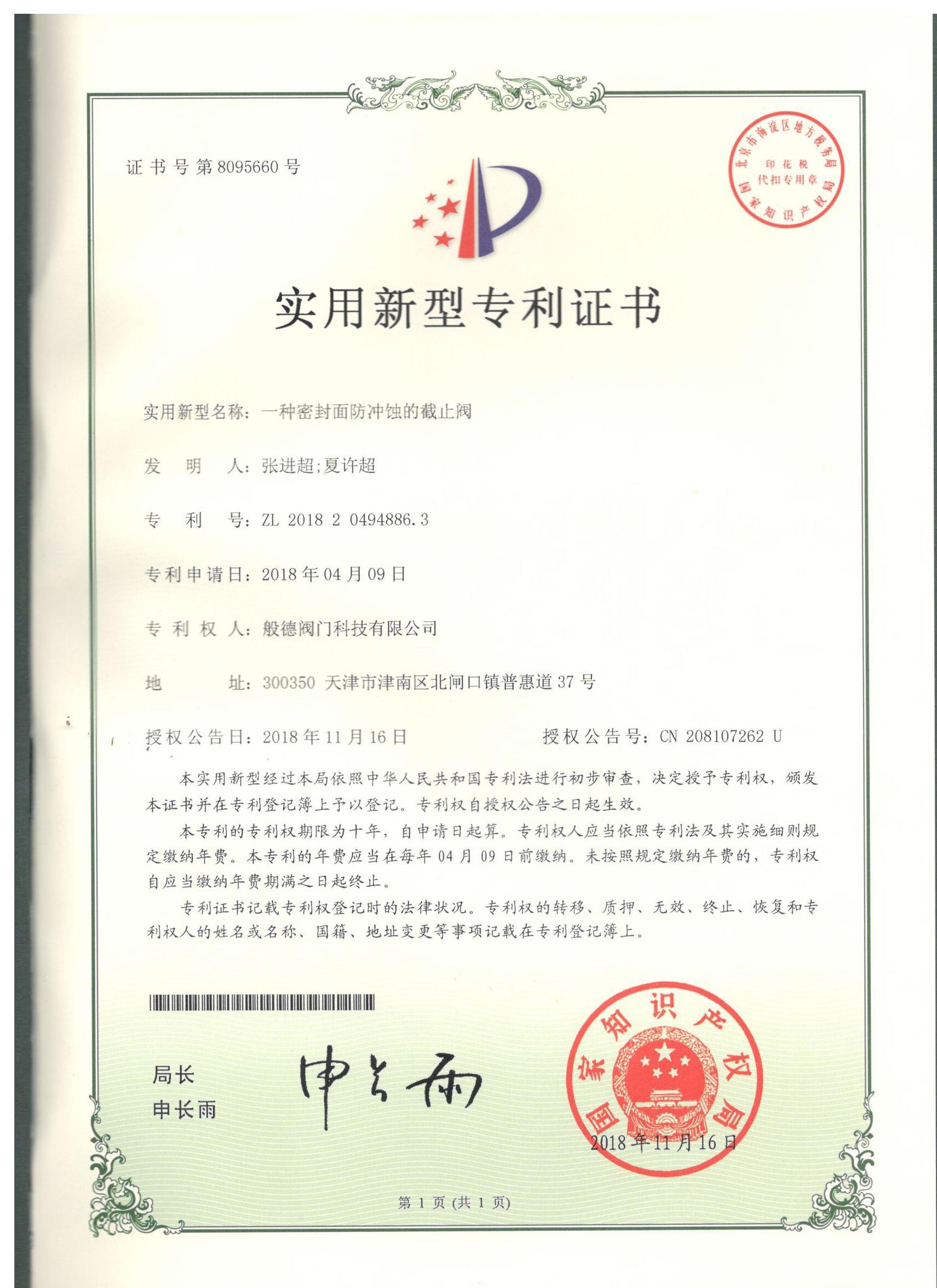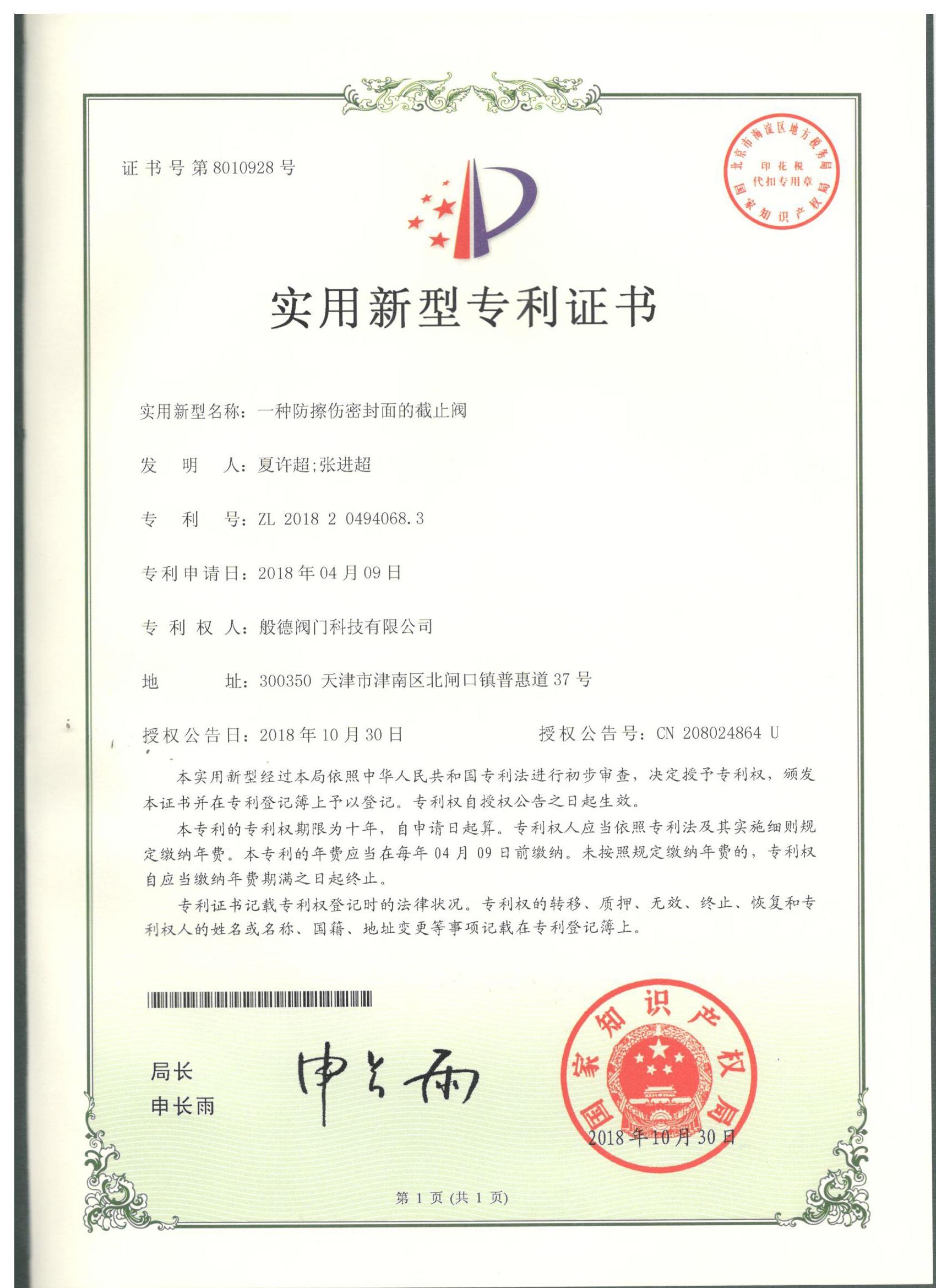 - 專(zhuān)利-一種防擦傷密封面的截止閥>>查看證書(shū)