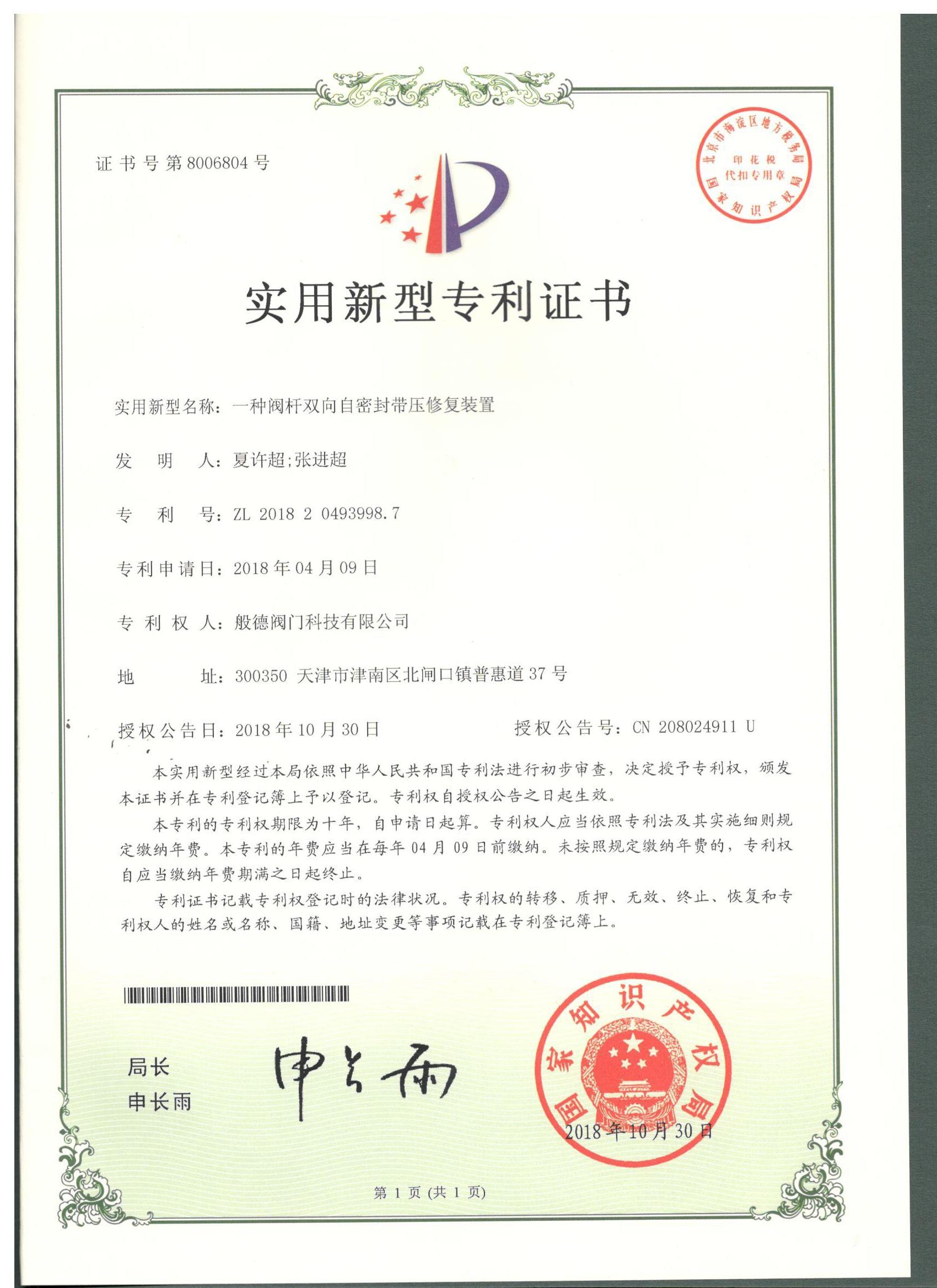 - 專(zhuān)利-一種一種閥桿雙向自密封帶壓修復(fù)裝置>>查看證書(shū)