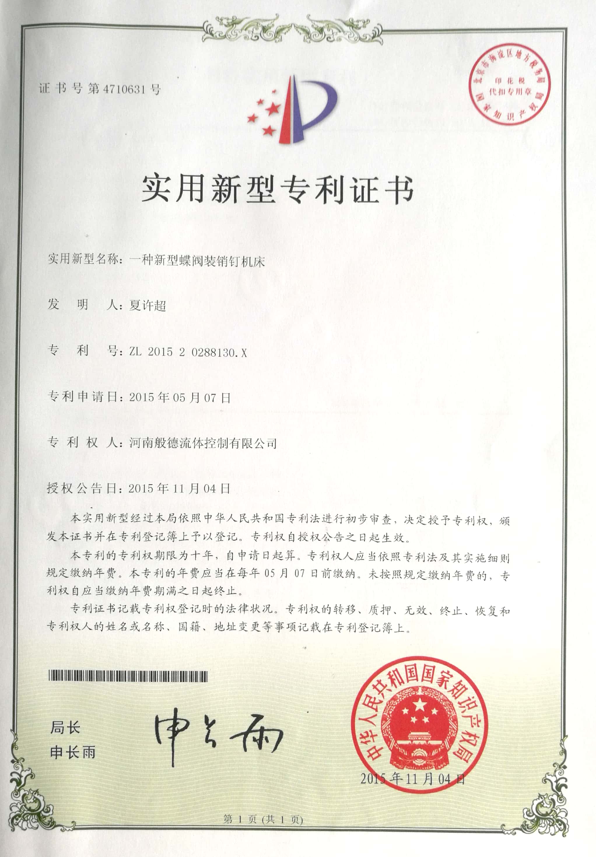 - 專(zhuān)利-一種新型蝶閥裝銷(xiāo)釘機(jī)床>>查看證書(shū)