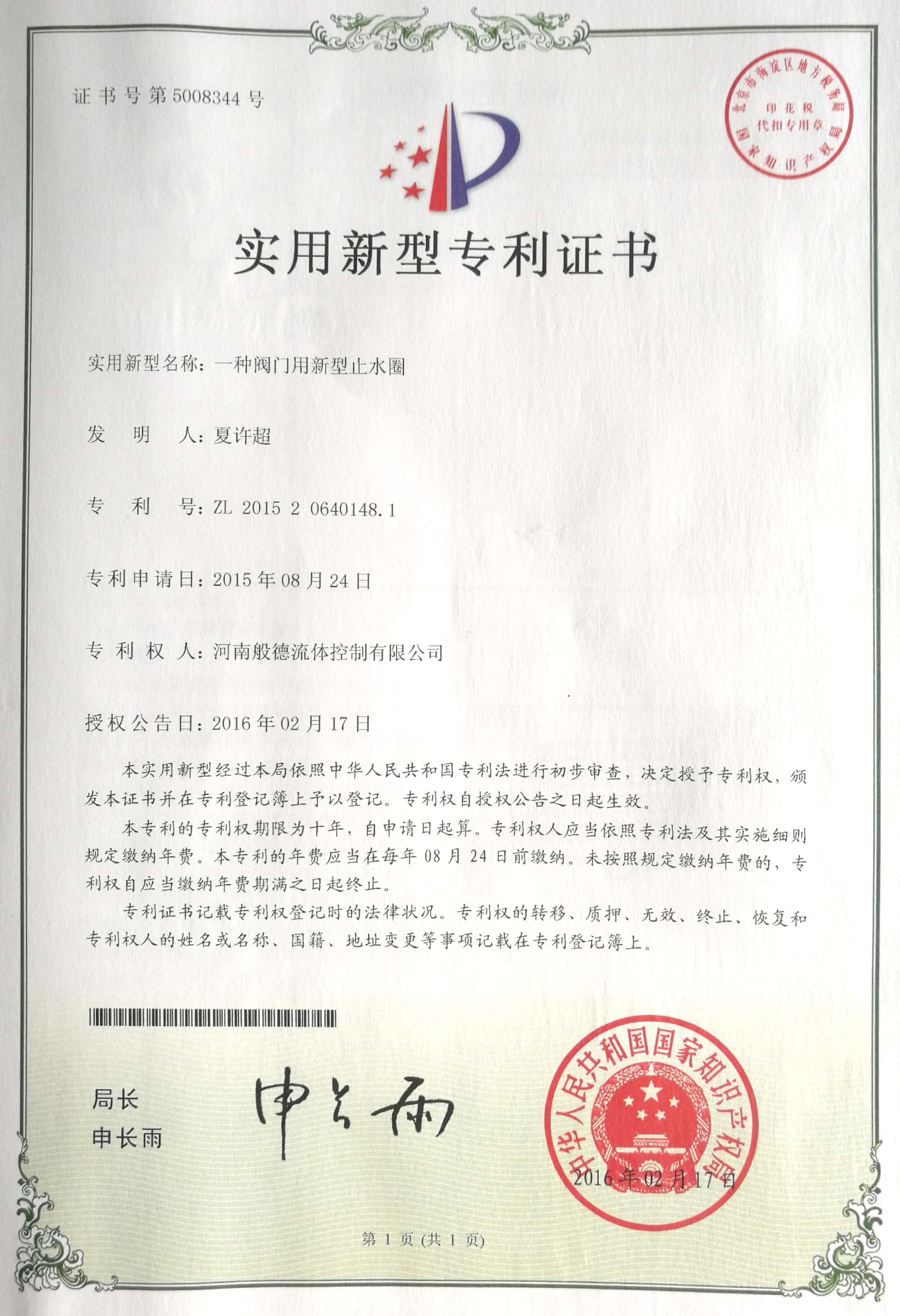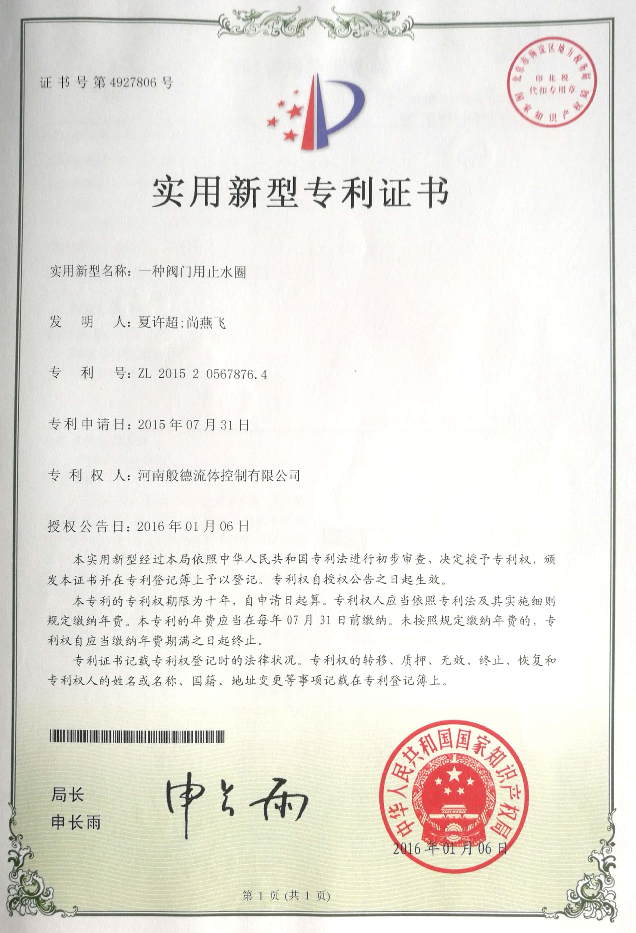 - 專(zhuān)利-一種閥門(mén)用新型止水圈>>查看證書(shū)