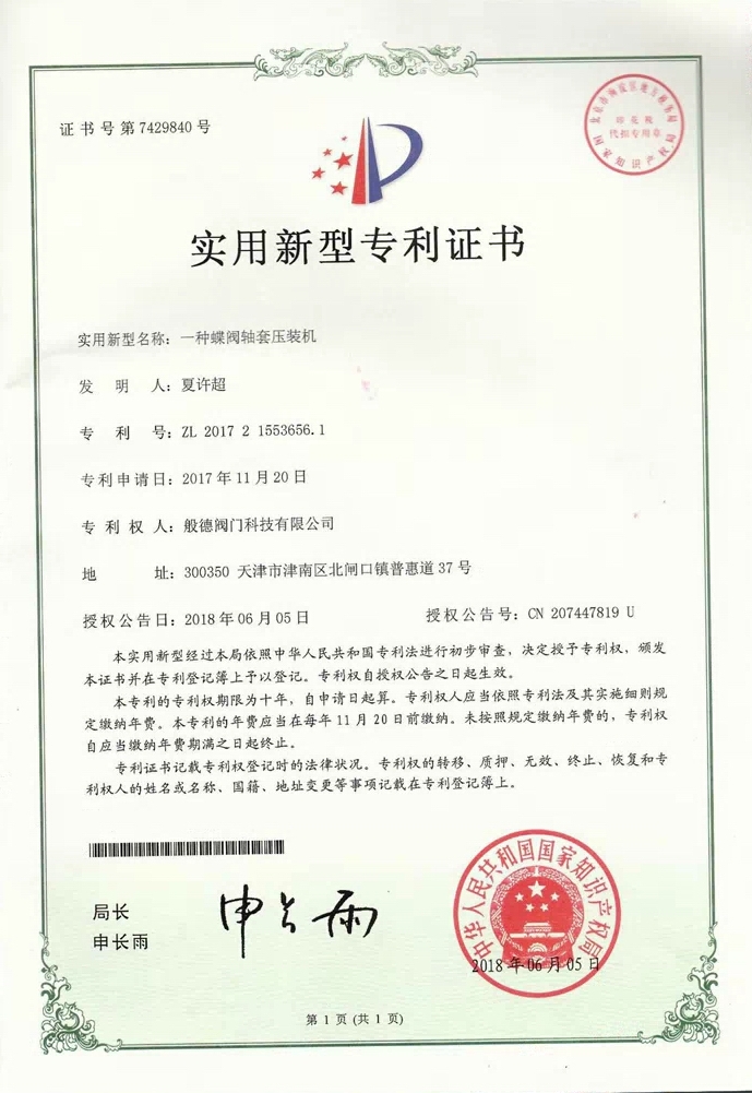 - 專(zhuān)利-一種蝶閥軸套壓裝機(jī)>>查看證書(shū)