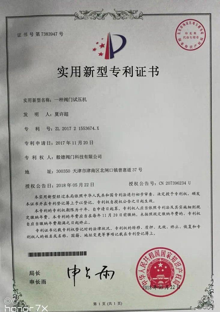 - 專(zhuān)利-一種閥門(mén)試壓機(jī)>>查看證書(shū)