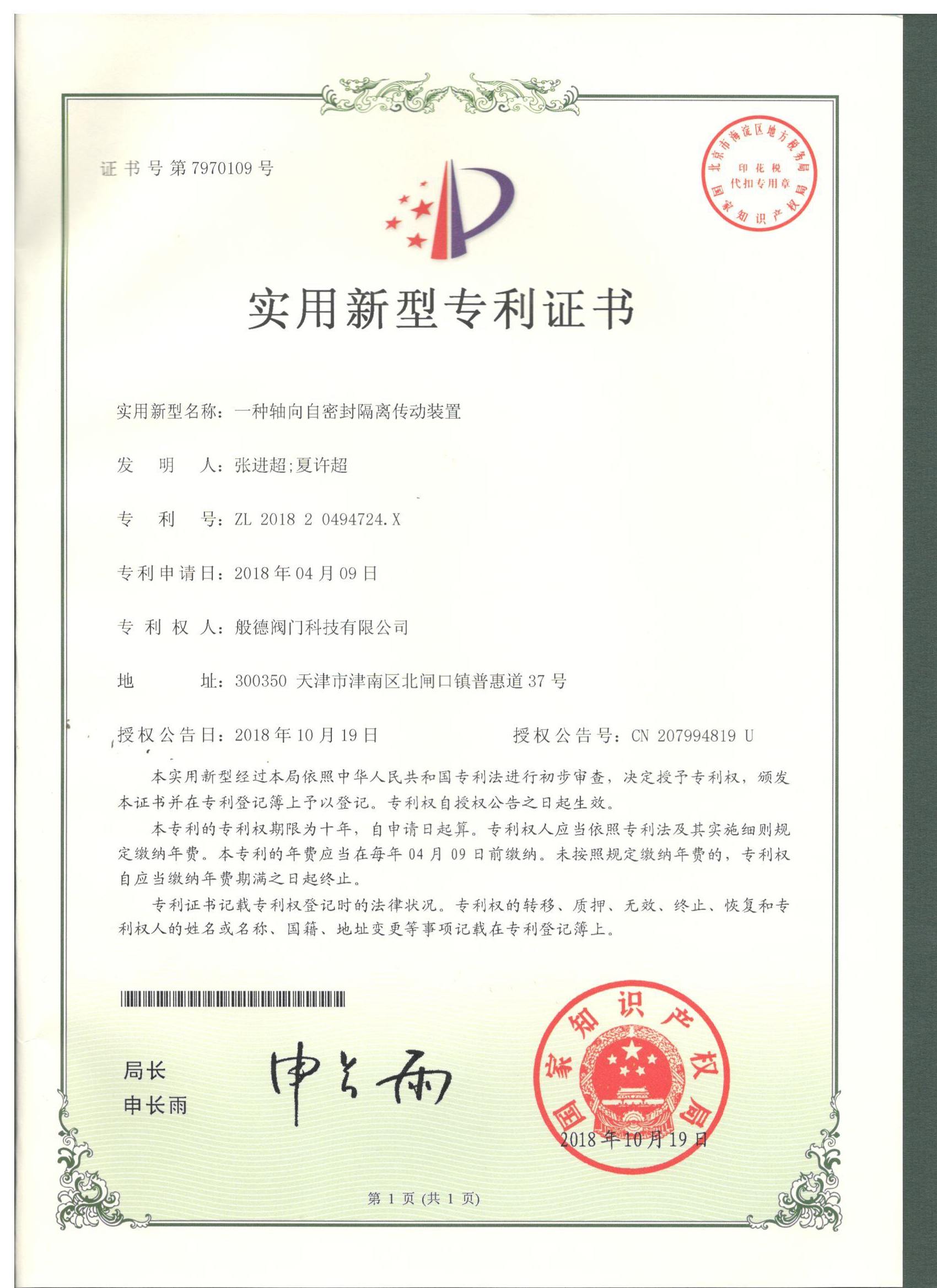 - 專(zhuān)利-一種軸向自密封隔離傳動(dòng)裝置>>查看證書(shū)