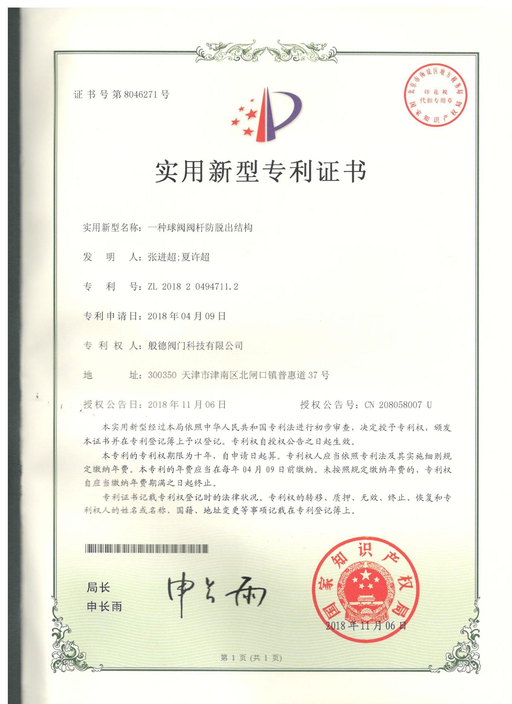 - 專(zhuān)利-一種球閥閥桿防脫出結(jié)構(gòu)>>查看證書(shū)