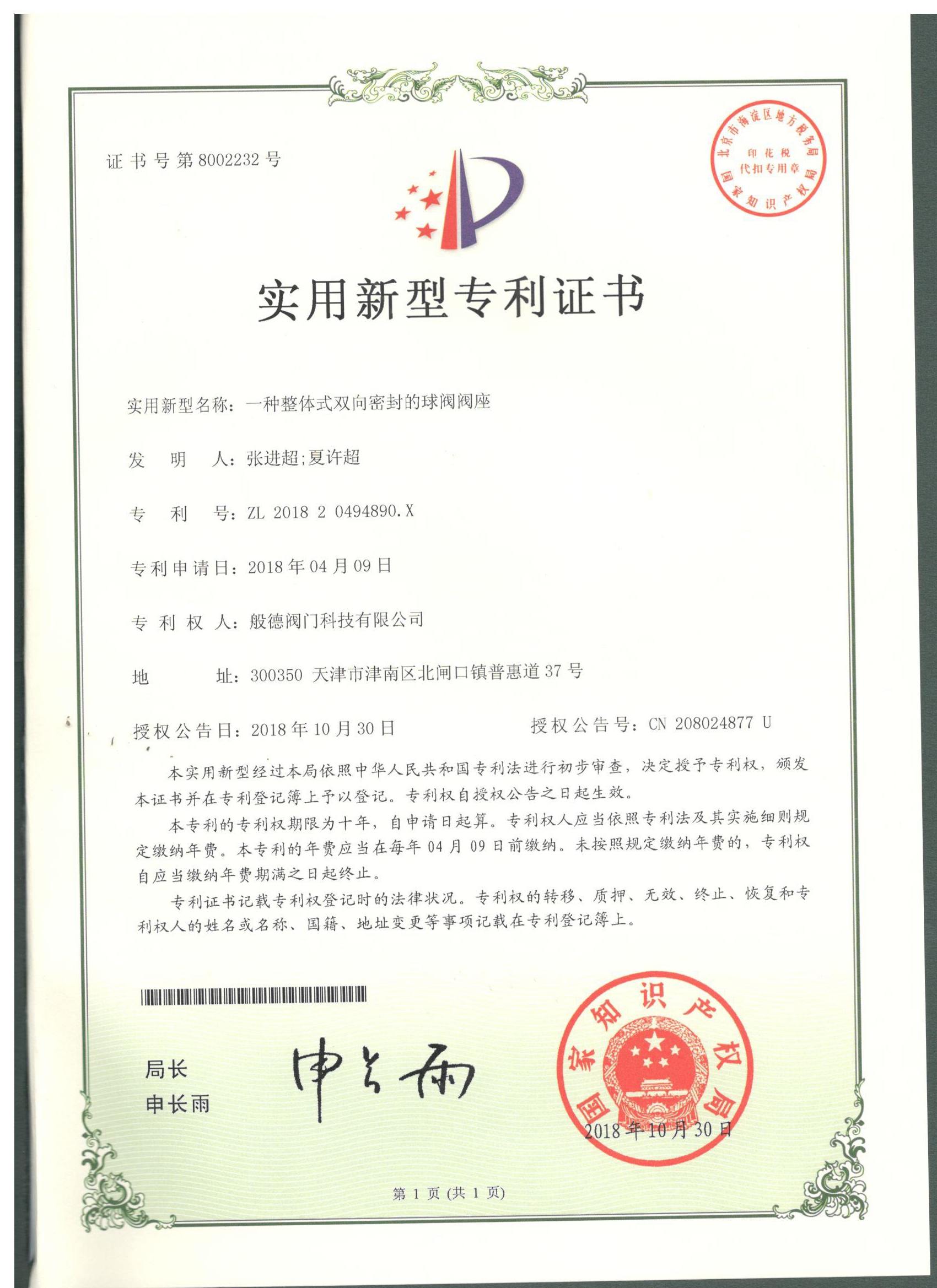 - 專(zhuān)利-一種整體式雙向密封的球閥閥座>>查看證書(shū)