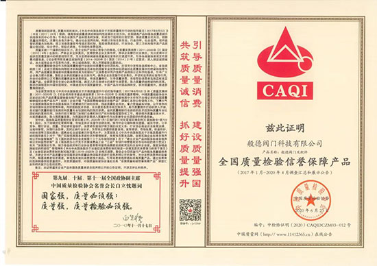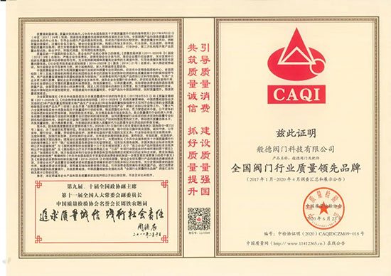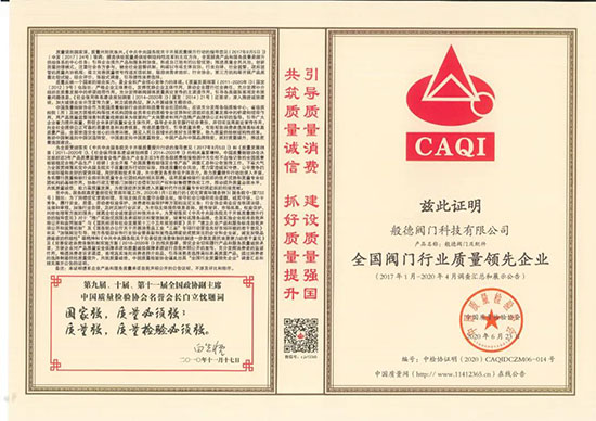 般德閥門榮獲CAQI“全國閥門行業(yè)質(zhì)量領(lǐng)先品牌”、“全國閥門行業(yè)質(zhì)量領(lǐng)先企業(yè)”、“全國質(zhì)量檢驗(yàn)信譽(yù)保障產(chǎn)品”。