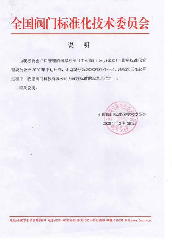 圖|般德閥門是《工業(yè)閥門 壓力試驗(yàn)》標(biāo)準(zhǔn)的起草單位之一