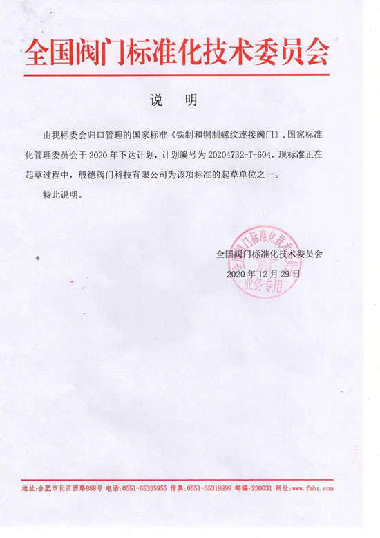 圖|般德閥門是《鐵制和銅制螺紋連接閥門》標(biāo)準(zhǔn)的起草單位之一