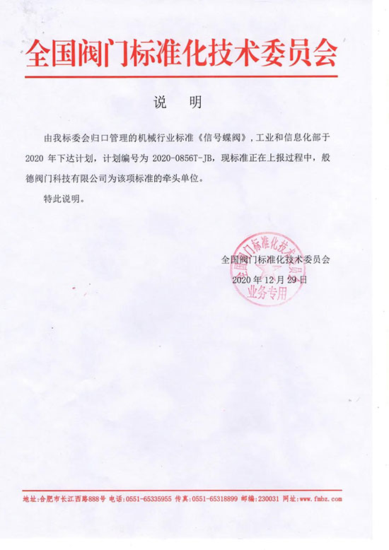 般德閥門是機(jī)械行業(yè)標(biāo)準(zhǔn)《信號蝶閥》的牽頭單位,《工業(yè)閥門的逸散性試驗(yàn)》、《通用閥門 不銹鋼鑄件技術(shù)條件》、《鐵制和銅制螺紋連接閥門》、《工業(yè)閥門 壓力試驗(yàn)》四項(xiàng)標(biāo)準(zhǔn)的起草單位之一。
