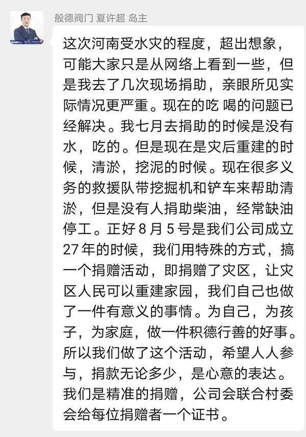 般德閥門27歲生日,我們決定一起做一件有意義的事!般德閥門總經(jīng)理夏許超帶頭發(fā)起“抗洪救災(zāi)愛(ài)心捐款”活動(dòng),捐款全部購(gòu)買老鄉(xiāng)們急需的物資,助力災(zāi)后重建。