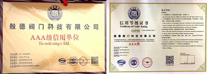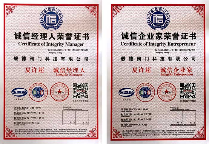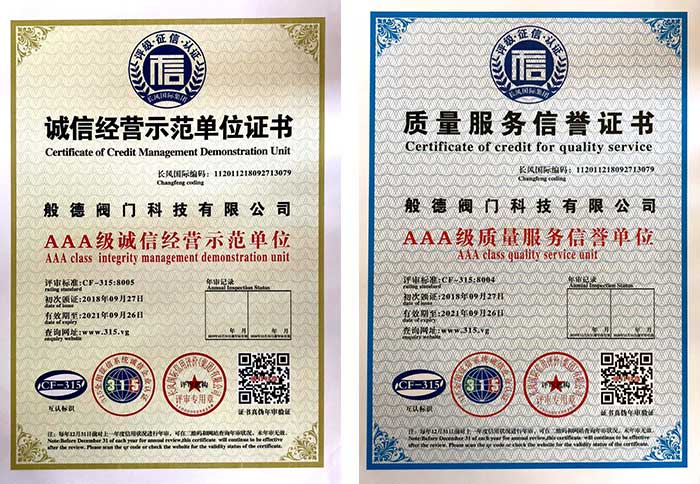 經(jīng)過315全國征信系統(tǒng)嚴(yán)格的評(píng)定,般德閥門科技有限公司榮獲多項(xiàng)315全國征信系統(tǒng)誠信企業(yè)認(rèn)證榮譽(yù),以下為證書展示: