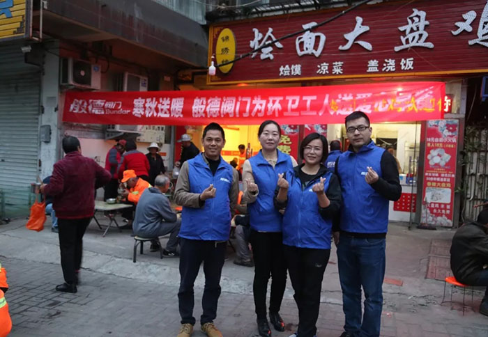 進(jìn)入10月,天氣逐漸寒冷起來(lái)。為大力弘揚(yáng)社會(huì)主義核心價(jià)值觀,充分彰顯城市文明,感謝環(huán)衛(wèi)工人每天為城市環(huán)境的辛勤付出,般德閥門(mén)承包了早餐店,為環(huán)衛(wèi)工人發(fā)放愛(ài)心早餐,給他們送去寒秋里的溫暖。