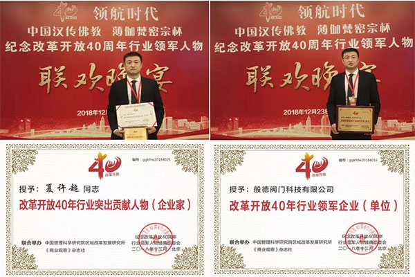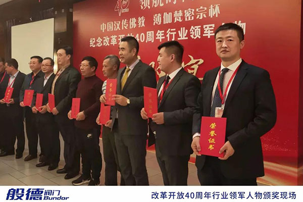 般德閥門科技有限公司董事長夏許超先生獲“改革開放40年行業(yè)突出貢獻企業(yè)家”榮譽稱號,般德閥門科技有限公司獲“改革開放40年行業(yè)領(lǐng)軍企業(yè)”榮譽稱號。