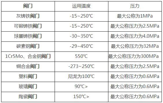 常見閥門運(yùn)用溫度及壓力一覽表